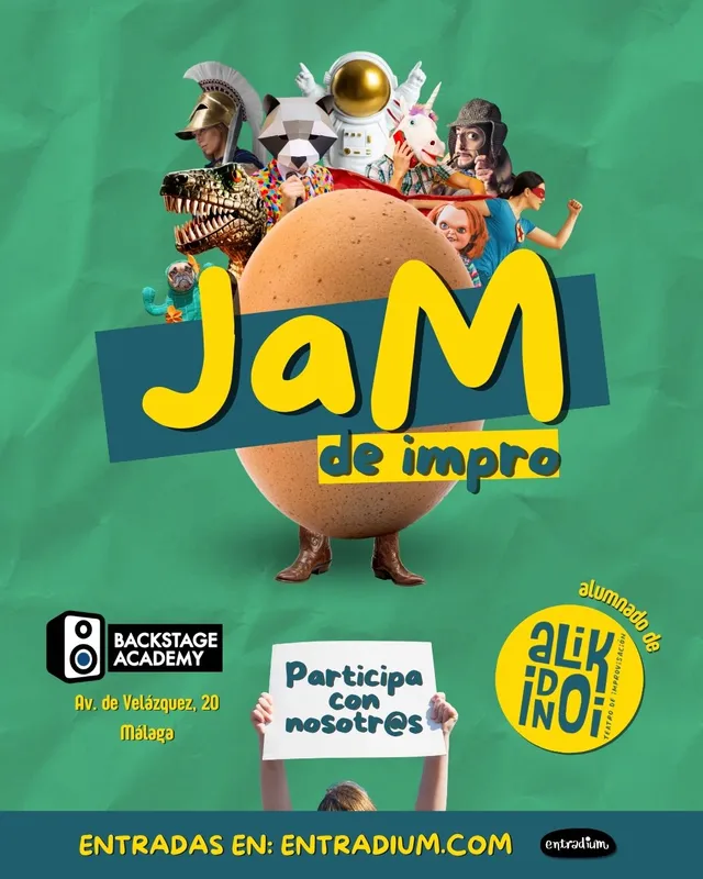Las entradas para la jam tienen un precio de 6 euros y se pueden adquirir en Entradium.com. En este enlace tienes todos los shows que organizamos en Backstage Academy, tanto a nivel de JAMS, como de la compañía Alikindoi Impro.